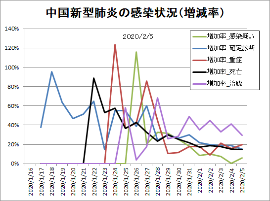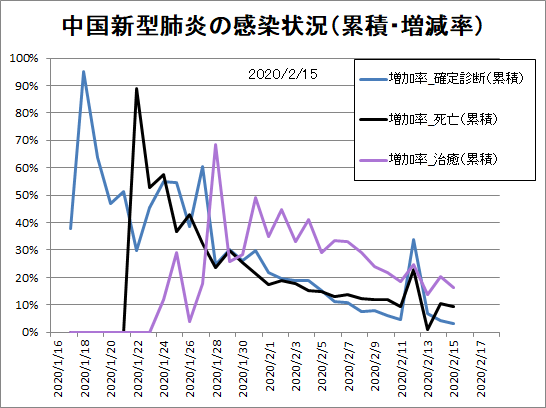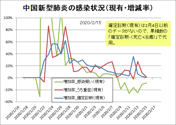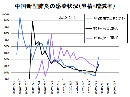 増減率は2月12日時点の定義拡大で一瞬増えたように見え、2月13日時点の重複分消去でいきなり伸びが止まったように見えます。しかし均せばゆるやかに低下。単に分母が大きくなっただけという気もしますが、横這いや上昇していないだけマシです。